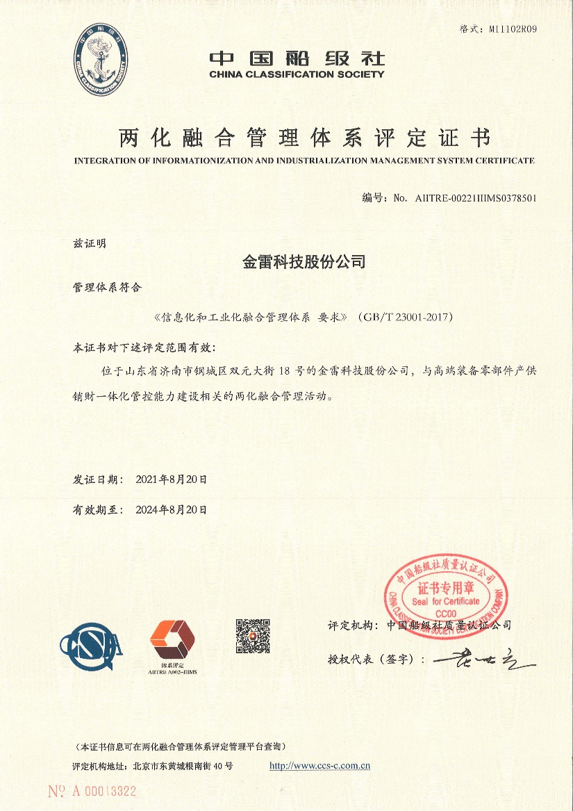 8月20日,多宝官方网站通过工信部最终审核,荣获中国船级社颁发的“两化融合管理体系评定证书”。这标志着公司信息化建设迈上了一个新的台阶,在推进信息化和工业化融合方面取得了突破性的成果,并获得了国家专业机构的认可。