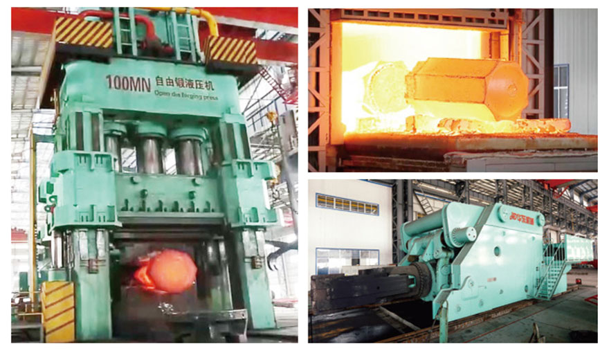 进行锻造模拟,结合WHF法、FM法、JTS法、SUF法等科学锻造法,搭配合理的锻造热处理工 艺,有效的改善锻件内部组织、细化晶粒,使锻件获得良好的性能。独有的空心主轴锻造技术更是全球领先,10000t压 机、150t全液压操作机、全自动蓄热式加热炉、热处理炉等设备水平位居同行业前列。